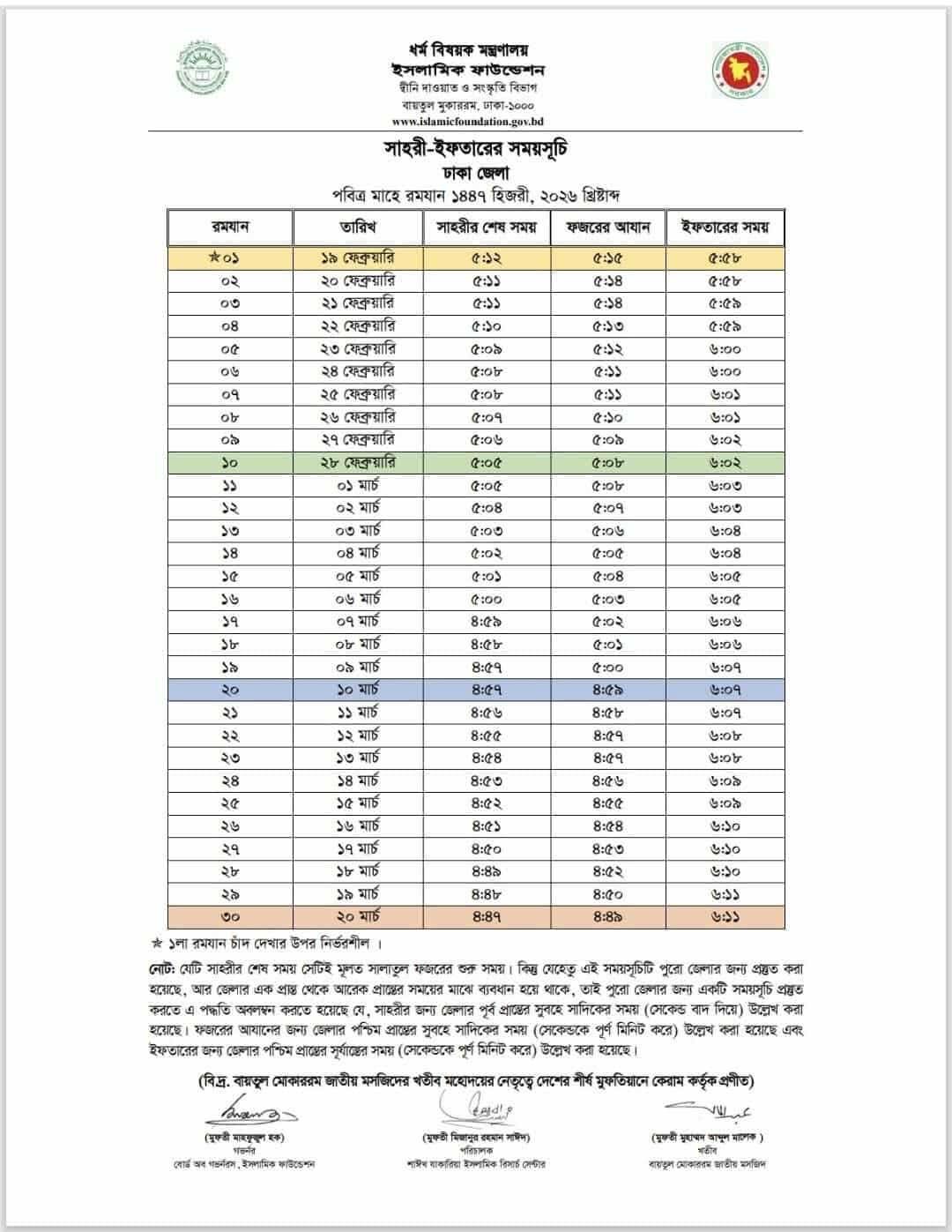 প্রকাশিত সময়সূচি অনুযায়ী, আগামী ১৯ ফেব্রুয়ারি যদি প্রথম রমজান শুরু হয়, তবে সেদিন রাজধানী ঢাকায় সেহরির শেষ সময় হবে ভোররাত ৫টা ১২ মিনিট। একই দিনে ইফতারের সময় নির্ধারিত হয়েছে সন্ধ্যা ৫টা ৫৮ মিনিটে। দেশের ভৌগোলিক অবস্থানের কারণে জেলাভেদে সময়ের কিছুটা তারতম্য হবে। ইসলামিক ফাউন্ডেশন থেকে জানানো হয়েছে যে, ঢাকার সময়ের সঙ্গে দূরত্ব অনুযায়ী দেশের বিভিন্ন অঞ্চলের মানুষ সর্বোচ্চ ৯ মিনিট পর্যন্ত যোগ করে অথবা ৯ মিনিট পর্যন্ত বিয়োগ করে সেহরি ও ইফতার সম্পন্ন করবেন। মূলত বায়তুল মোকাররম জাতীয় মসজিদের ঘড়ি অনুযায়ী এই আদর্শ সময় নির্ধারণ করা হয়েছে।