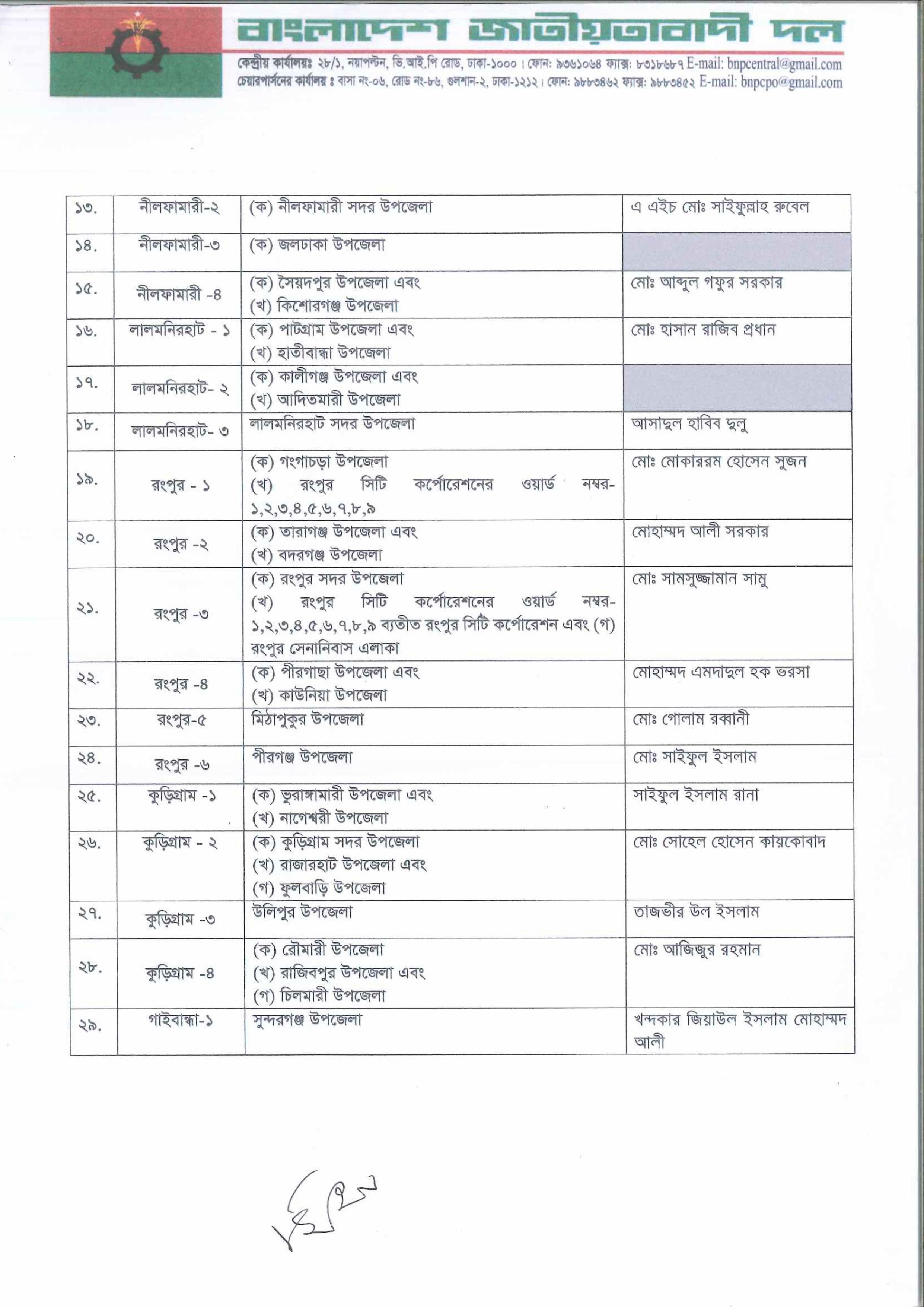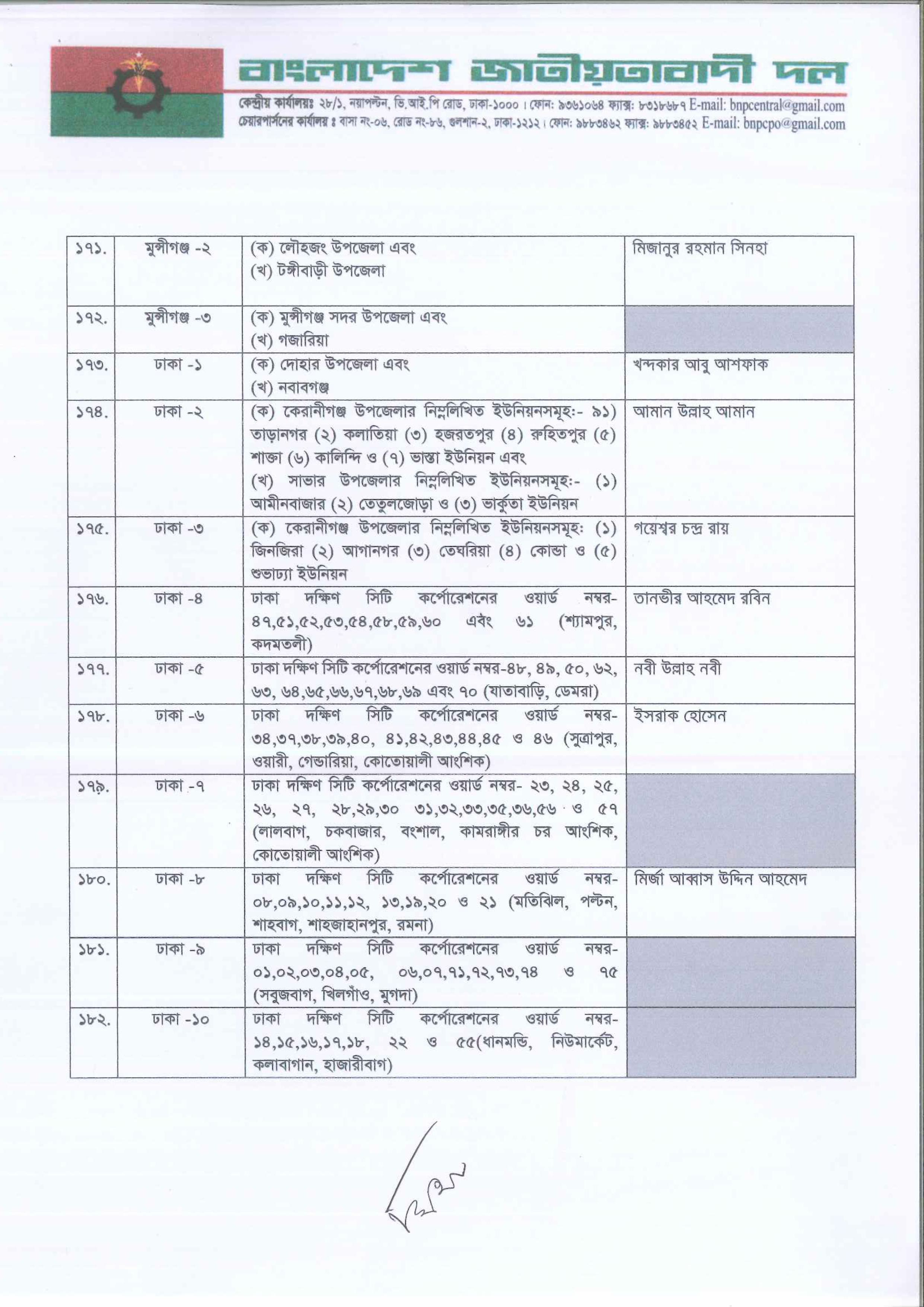দলটির মহাসচিব মির্জা ফখরুল ইসলাম আলমগীর নিজে ঠাকুরগাঁও-১ আসন থেকে নির্বাচনে প্রতিদ্বন্দ্বিতা করবেন। এছাড়াও, রাজধানী ঢাকার কয়েকটি আসনেও গুরুত্বপূর্ণ প্রার্থীদের নাম ঘোষণা করা হয়েছে: